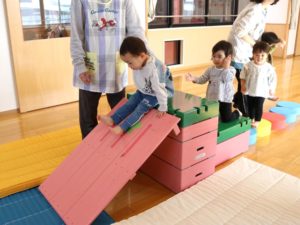 滑り台やカラー積み木などで、自由にのびのび遊んでいましたよ♪