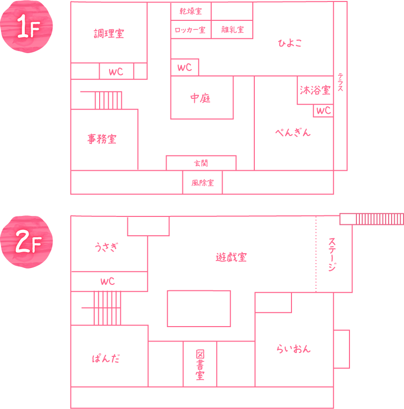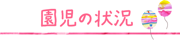 【定員 90名(+一号園児10名)】 【現在 98名(令和7年4月1日現在)】 ・ひよこ組(0歳児)/5名 ・ぺんぎん組(1歳児)/18名 ・うさぎ組(2歳児)/18名 ・ぱんだ組 (たんぽぽ組 3歳児/23名) 計23名 ・らいおん組 (すずらん組・4歳児/20名) (ひまわり組・5歳児/14名) 計34名