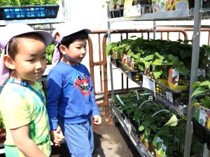 野菜の苗にはそれぞれ写真がついているので、それを見ながら「トマトだ!」「なすびあった!」と見つけたものを報告してくれたのですが・・・