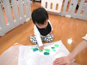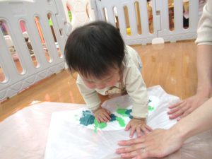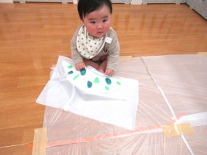 赤ちゃんは手が汚れるのを嫌がる子も多いのですが、ビニールの上からだったので、みんな興味津々✨