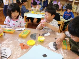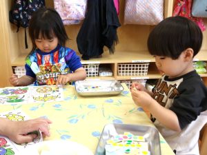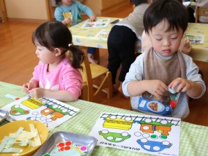シール台紙からはがしたり、目的の場所に貼ったりと、手先の器用さを育てることに繋がる活動。