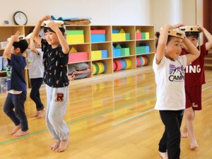 水たまりに見立てたフープを避けて動いたり、音楽に合わせて水たまりに入ったり♪