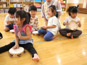 年中さんは、2人1組でタンバリンを叩きました。