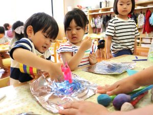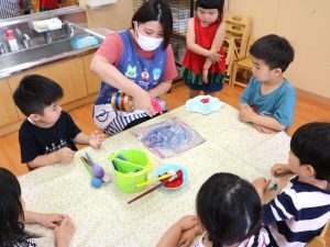 ぱんだ組は金魚鉢を作っていました!まず保育士が見本を見せます。
