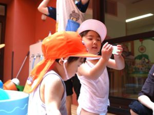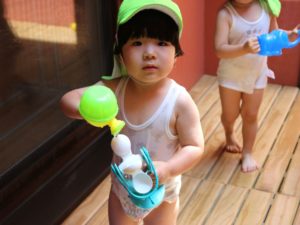 バケツやジョウロなどを使って、頭からびっしょり濡れて遊んでいました♪