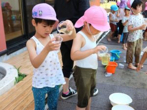 コップの水を移し替えたり、混ぜたりして実験を楽しむ子どもたち☺