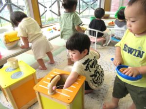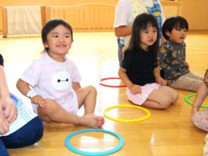 今日は”洗濯”をテーマに、フープを洗濯機にみたてて活動しました♪