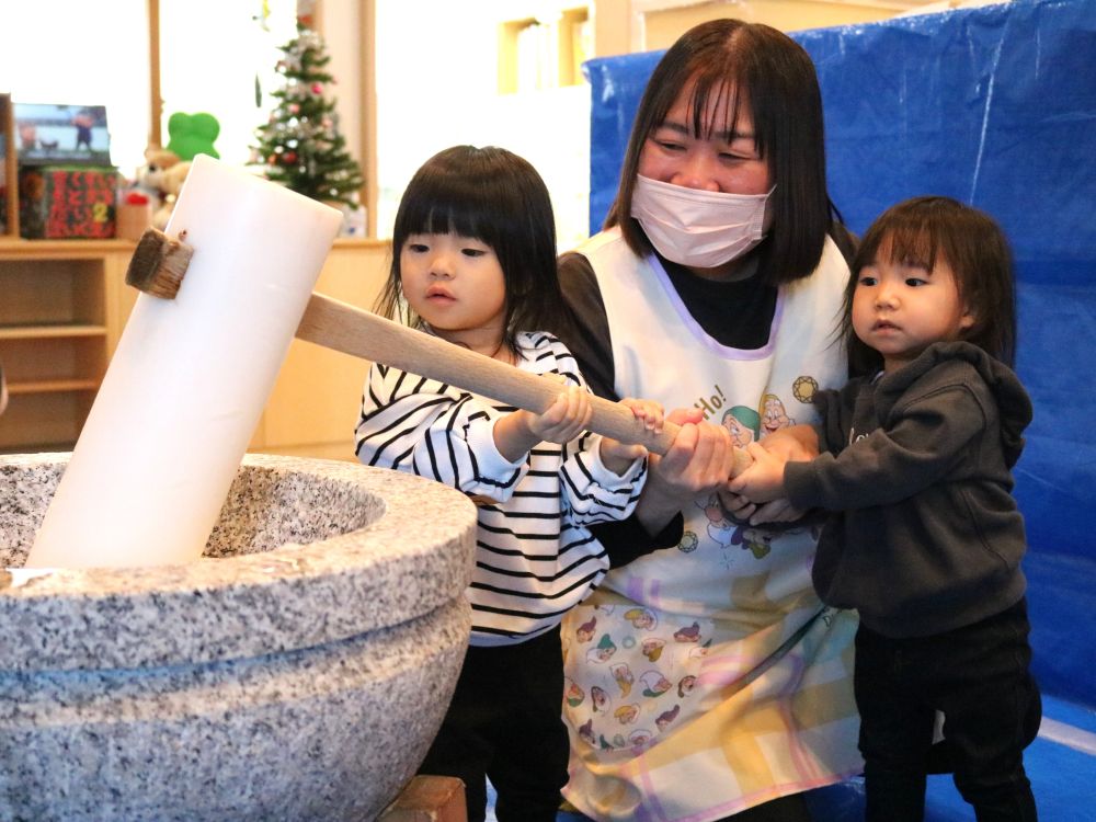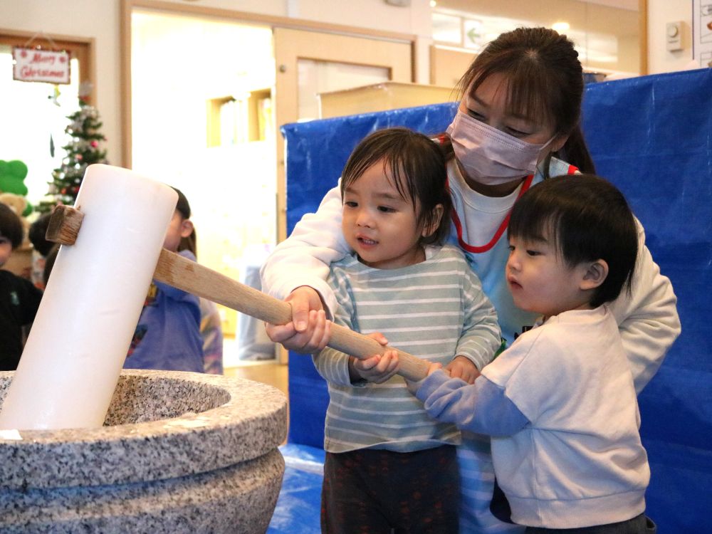 お昼寝後に保育室に行くと、「きょうおもちつき!たのしかた♡」と言って抱きついてきた子がいました♪