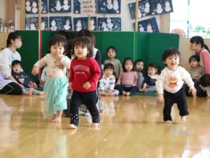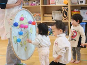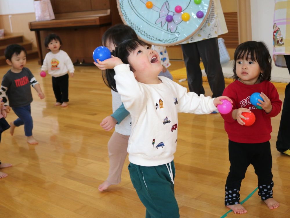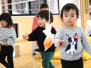 ひよこ・ぺんぎん組はホールで、みかん取り競争やボール投げをして遊びましたよ☺