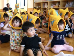 屋外で地震が起こったときは、遊具や塀の近くは危険なので、広くて何もないところでダンゴムシになります。