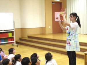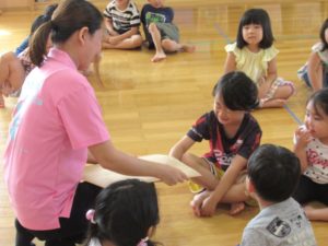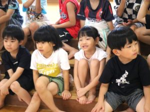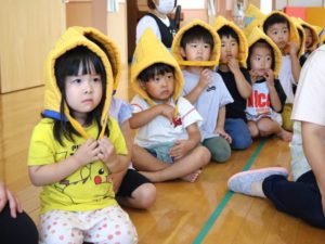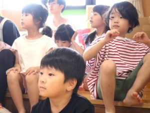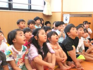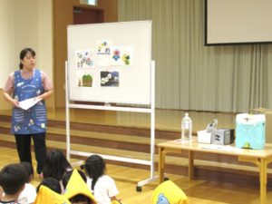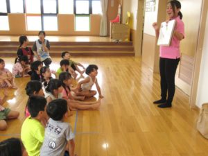 2階クラスはホールに集まって、まいこ先生のお話を聞きました。