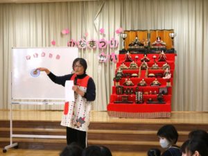 まず先生から、ひなまつりの由来や食べ物などについて教えてもらいました。