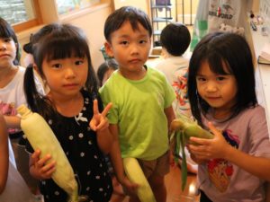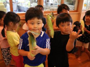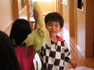 給食前には、おやつで食べるトウモロコシの皮むきを