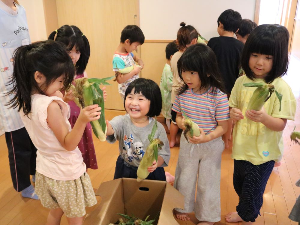 給食前には、おやつで食べるトウモロコシの皮むきを