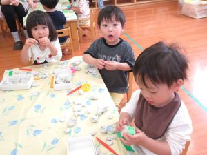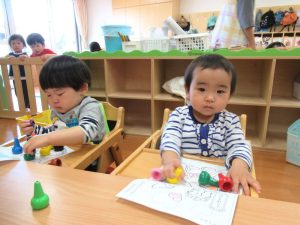カメラが気になって塗れない子もいましたが、保育士に励まされながら塗っている姿がとっても可愛かったです(笑)。