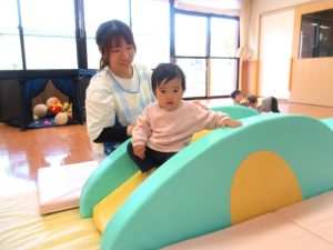 まだハイハイの子が多く、滑り台は難しいかと思いきや、上手に滑っているお友だちもいましたよ♪