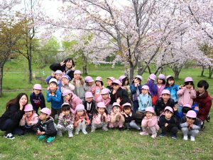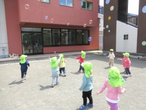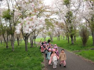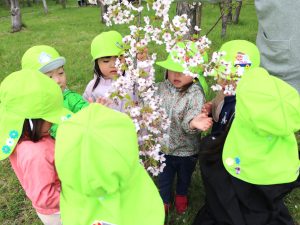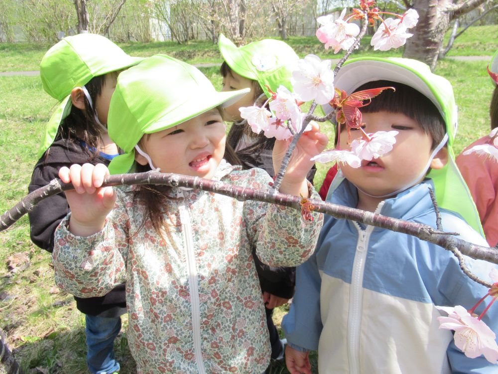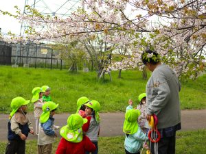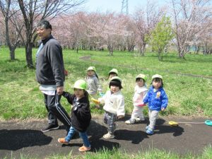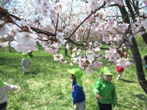 さて、らいおん組さんは朝から園庭へ、うさぎ組さんは桜の製作をしたあとに園庭に出ていきました。