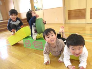 高く積み上げたり、車みたいにして乗ってみたり・・・みんなで工夫して遊びを広げています☺