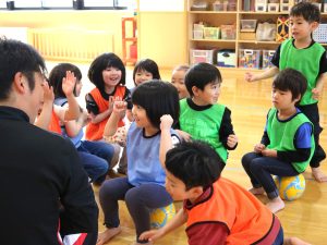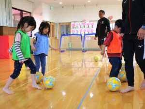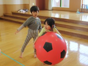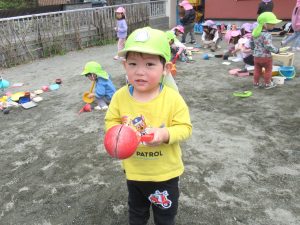 準備運動のあとは、ボールを持ってお散歩したり、毬つきしたりして、ボールと仲良しになります⚽