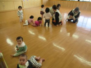 ひよこ・ぺんぎん組はホールで、みかん取り競争やボール投げをして遊びましたよ☺