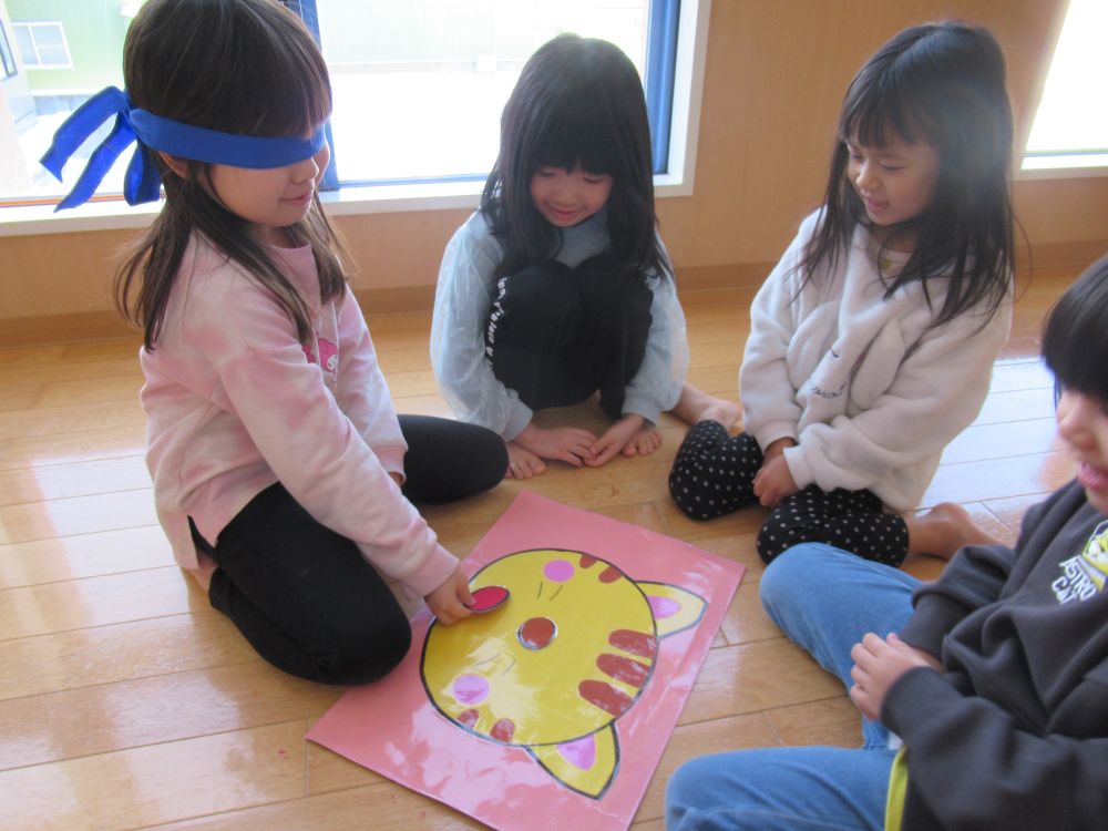 目隠しをして「もっと右~」「もっと下!」と指示を聞きながら貼りましたよ♪
