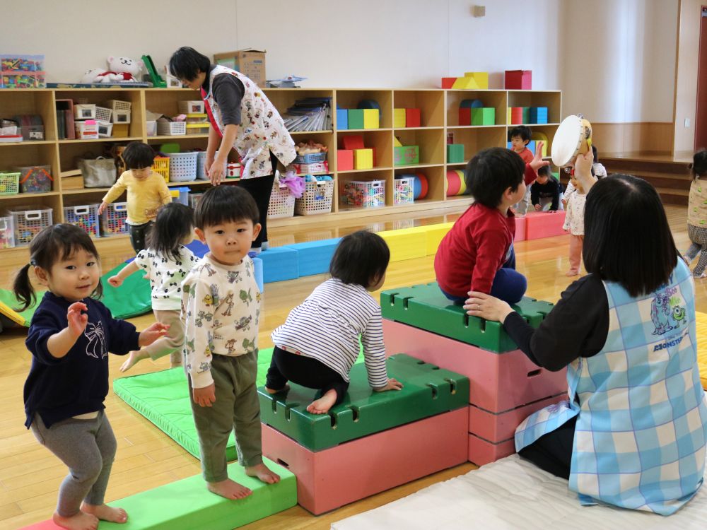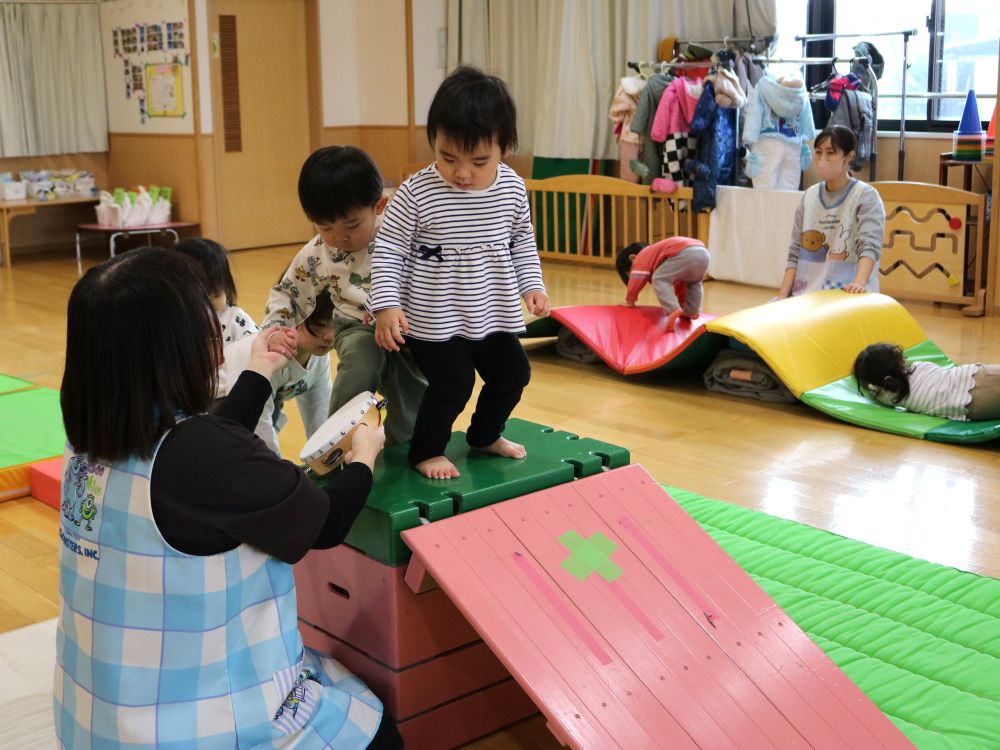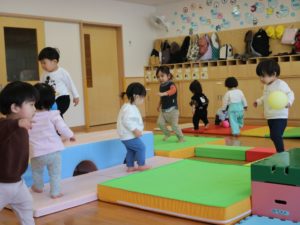 今日はひよこ、ぺんぎん組が小ホールでアスレチック遊びをしました。