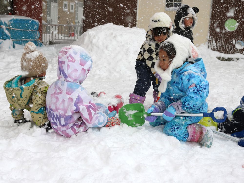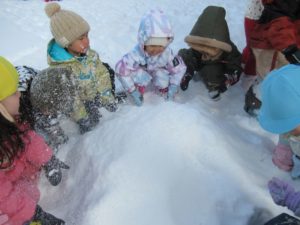 スコップで雪掻きごっこをしたり、雪玉を作って雪合戦をしたり。