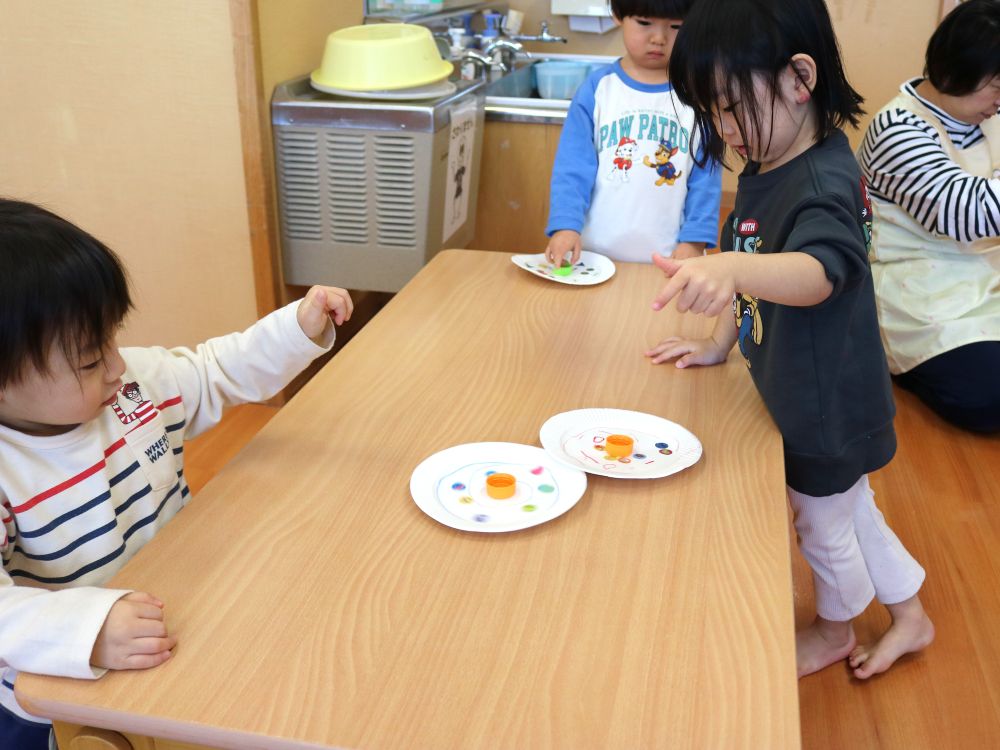 スプーンを使って、寒天をお皿に乗せて遊んでいる子もいました。