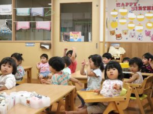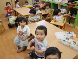 2階クラスが元気よくお外にお出かけするころ、ひよこさんは初めて朝の会をしていました♪