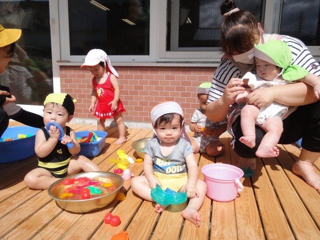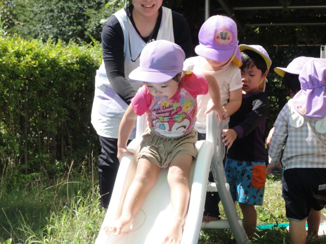 下のクラスも、今日は水遊びをしました。たんぽぽさんは小さな滑り台を出してきて、上からお水を流しながら滑り台をしました。「ウォータースライダーだよ」との事でしたが、滑り台の角度が急過ぎて、一瞬で落ちてしまい思ったようにはいかなかったようです。でも、これはこれで楽しかったようで、順番待ちの列ができていましたよ。来週は9月。水遊びができるのもあと少しかもしれませんね。