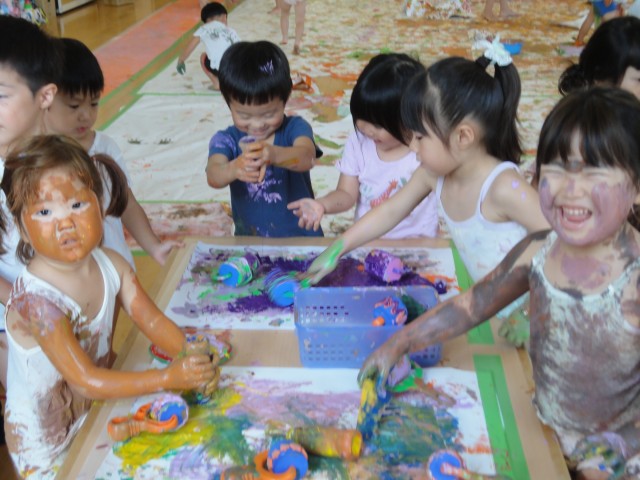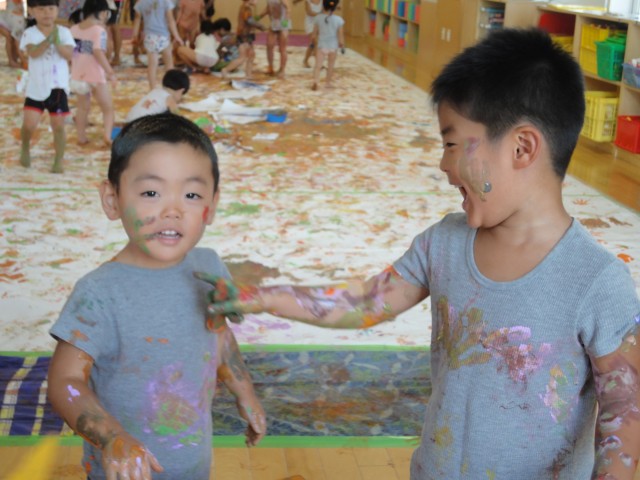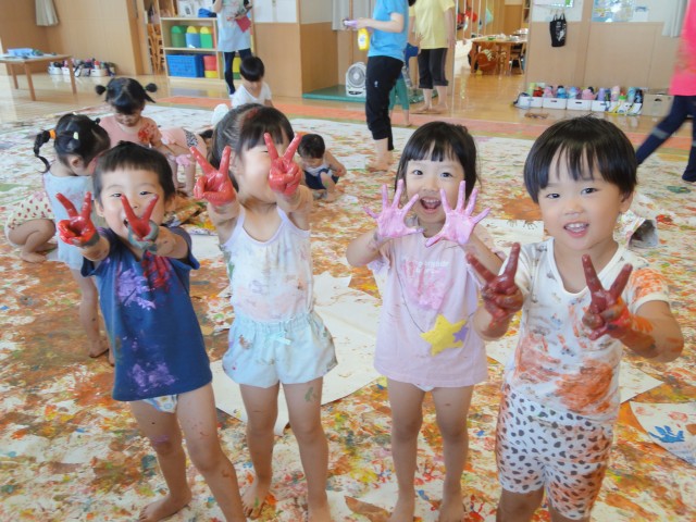 今日は上の3クラスが合同で『ボディーペインティング』をしました。ホールの床に模造紙を貼って、テラスまでの通路にも画用紙が貼られて道がつけられていました。最初はちゅうりっぷさんが思い切りシャツやパンツにまで手形を付けたりしていました。自分のお洋服だけでなく、お友だや先生のTシャツにも手形を付けて遊びました。