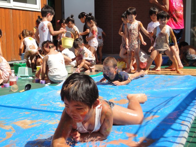 それから、テラスに出て、石鹸で泡立てて遊んだり、ブルーシートの上をスライディングして遊んだりしました。これが結構面白かったようで、何度も繰り返して滑っていましたよ。終了後は、頭からしっかりとシャワーを浴びて絵の具を落としました。今日使用した絵の具は『指絵の具』で普通の絵の具よりは洗うと落ちやすいものですが、落ち切れていない所があればごめんなさいね。