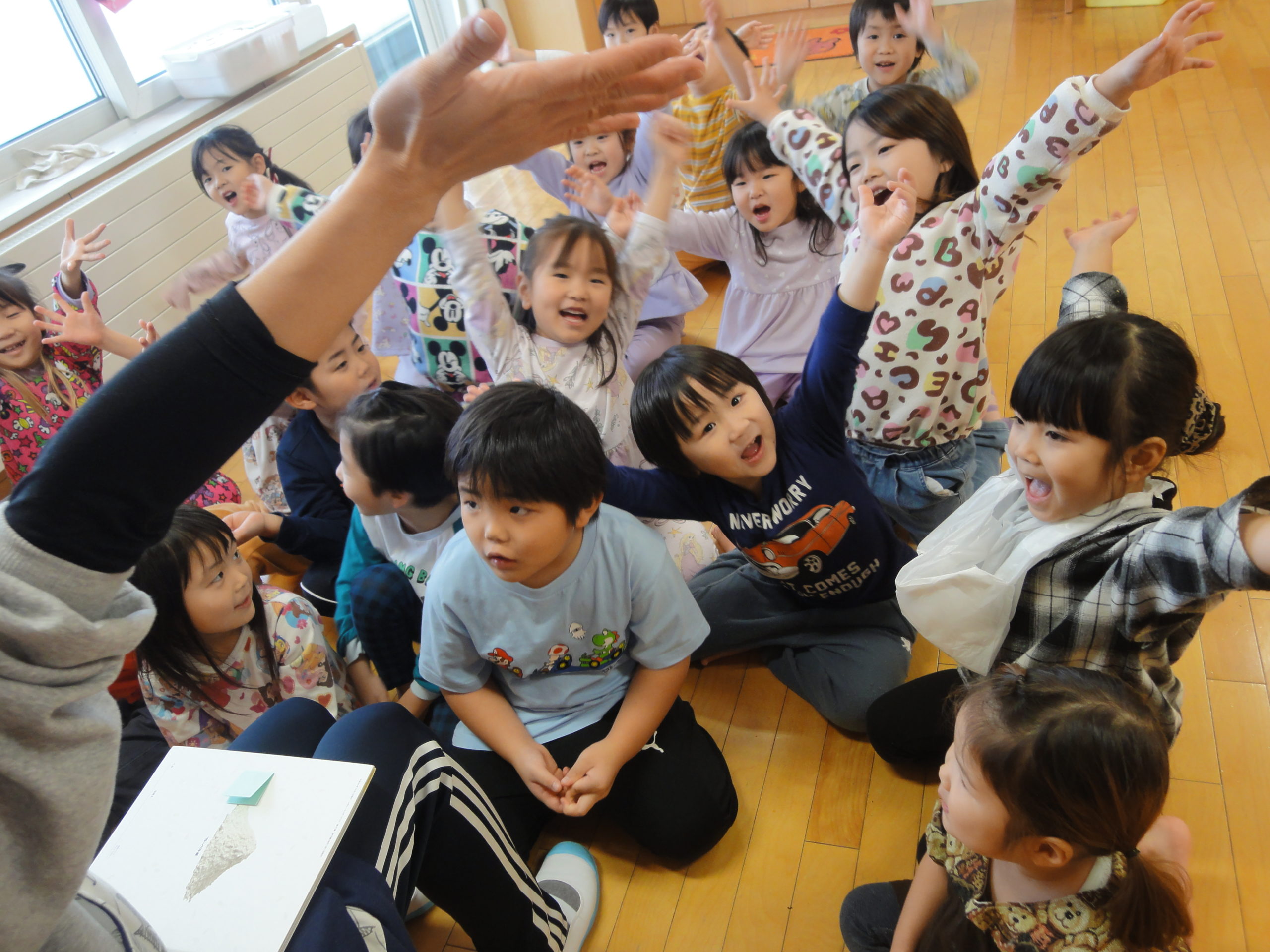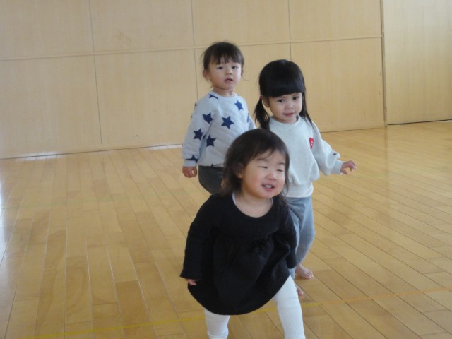 つくしさんの半分はホールで遊びました。怪獣になって『ガウ~』と言いながら、腰を落としてドシンドシンと歩いてみたり、ハイハイで進んでみたり、よういドンをしたりして遊びました。つぼみさんもお外に出ていたのですが、気付いた時には外遊びを終えていたので写真を撮れませんでした。保育園の子どもたちはたくましいですね~。