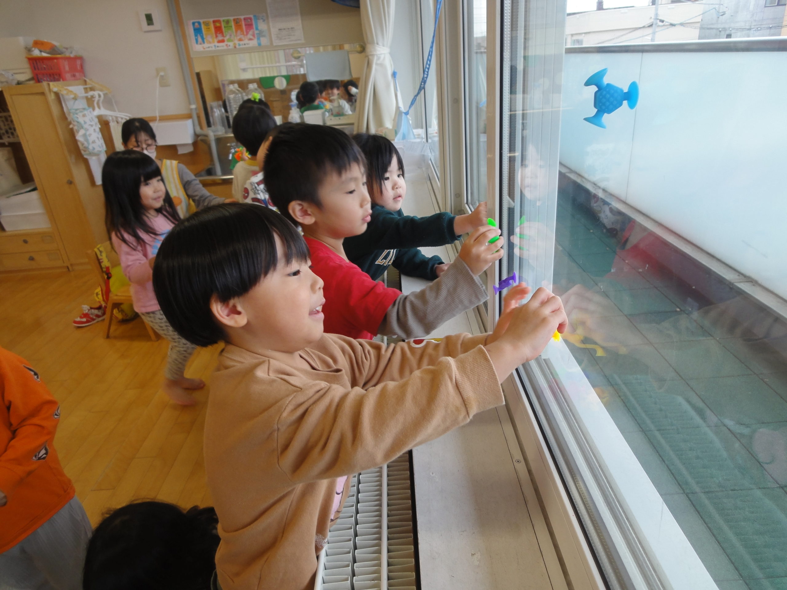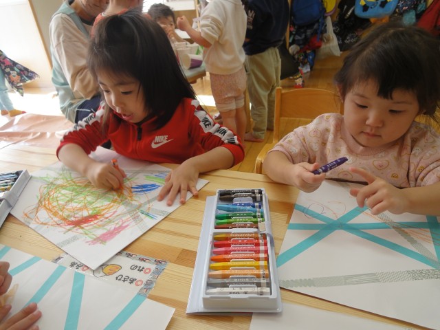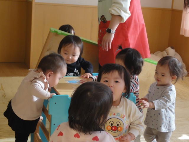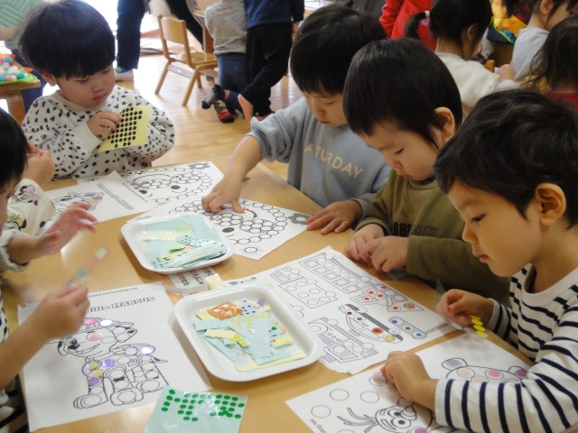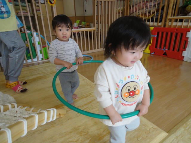 つくしさんではシール貼りやお絵かき、キラキラの宝石すくいなど好きな所で遊んでいましたよ。先生がアンパンマンの絵を描くと、ちゃんとほっぺの所に丸シールを貼っていましたよ。真剣なお顔でシール貼りをしていました。つぼみさんでは、フープを二人で持って、電車ごっこをしているようでした。つぼみさんなのにこんなことができるんですね!本当に成長を感じます。