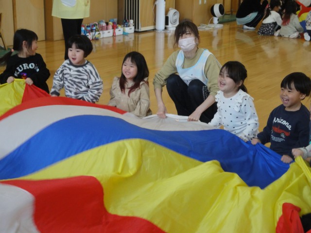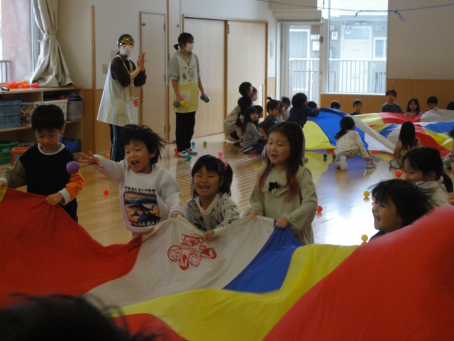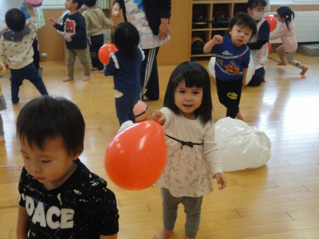 さて、上のクラスは3クラス合同で遊びました。全員でイスに座って、フルーツバスケットの要領で、お洋服(上の服)の色で行いました。おにが「赤!」と言ったら、ちょっとでも赤い色がお洋服に入っている子は椅子から立って違う椅子に座ります。「全部の色」と言われたら、全員が動かなければなりません。そんなゲームを楽しんでから、みんな大好きなバルーンを使ったゲームをしました。バルーンの中心にはカラーボールがたくさんあります。バルーンを上下に動かして、ボールをバルーンの外に早く出したチームが勝ちというゲームです。開始の合図と共にバルーンを激しく動かしていましたよ。いっぱい動かしてボールも勢いよく飛び出していました。みんなで仲良く楽しい時間を過ごしました。