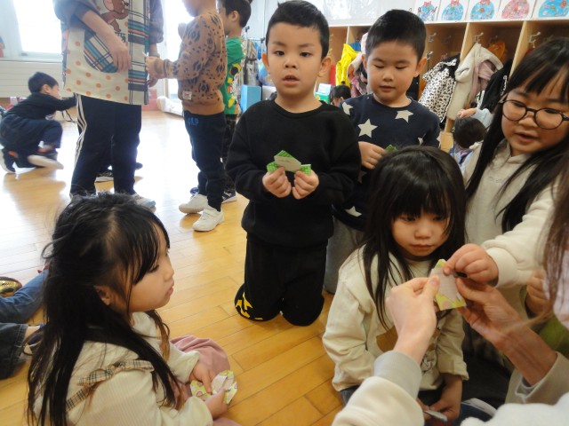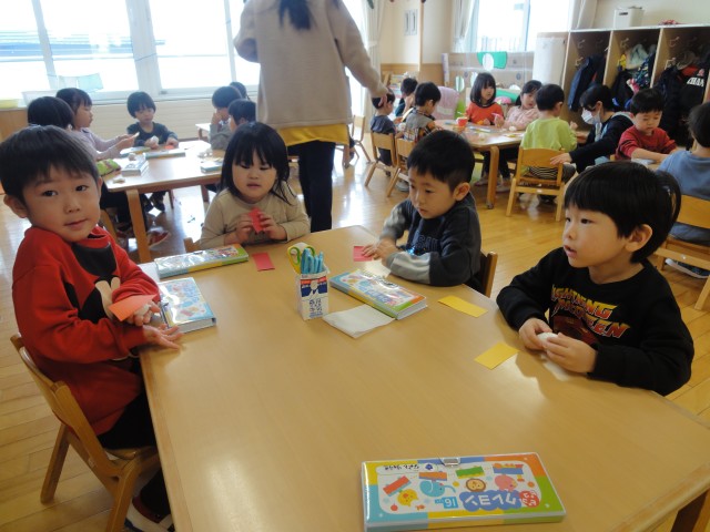 すみれさんではおすしを作っていました。ティッシュを丸めて、ごはんにし、赤やオレンジの画用紙を切ってネタにしていました。たったそれだけなのに、本当においしそうなおすしに見えてきました。子どもたちもおすしが大好きのようで、パクパク食べる真似をしていましたよ。ちゅうりっぷさんは折り紙でサンタさんを作っていました。それがちょっと難しい折り方だったので、苦労しているようでした。無事にでき上ったお友だちは悩んでいるお友だちを手伝ったりして、みんなで協力して作っている姿はさすがだなと思いました。