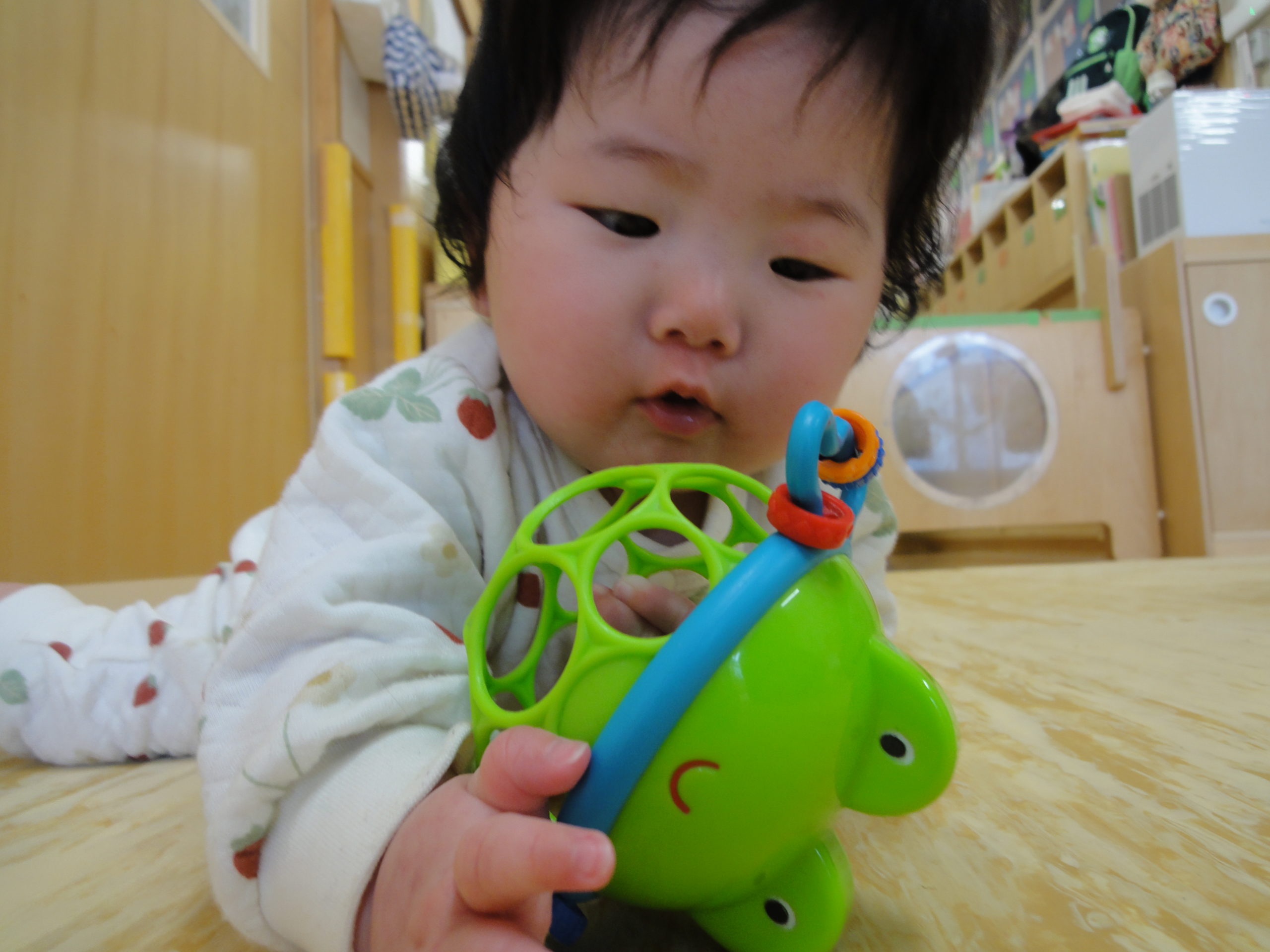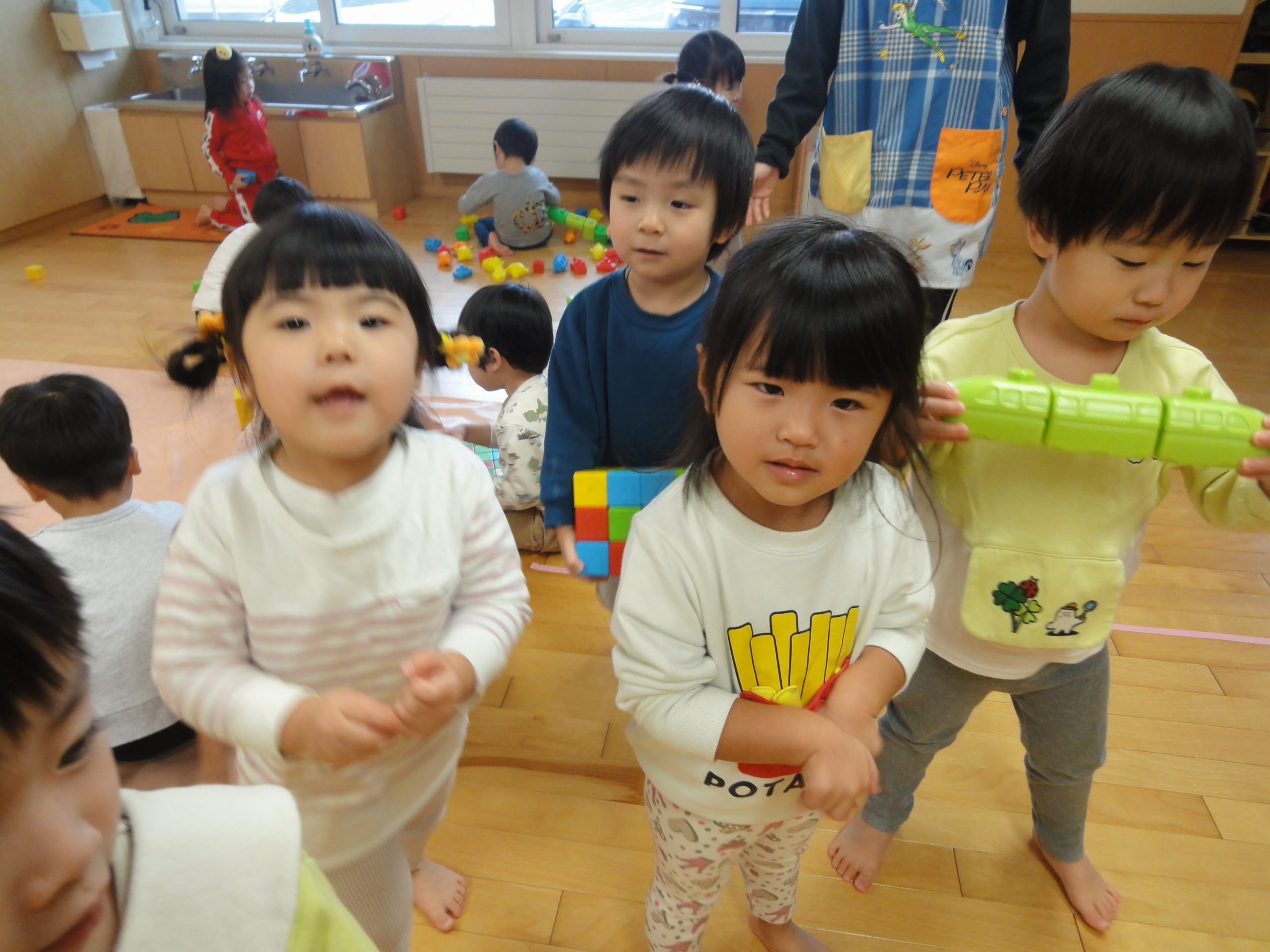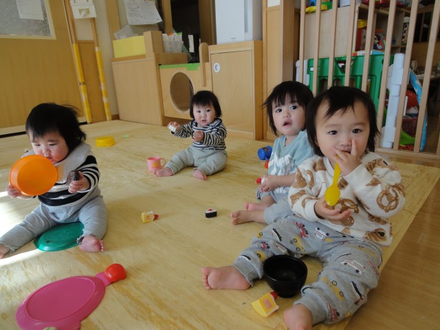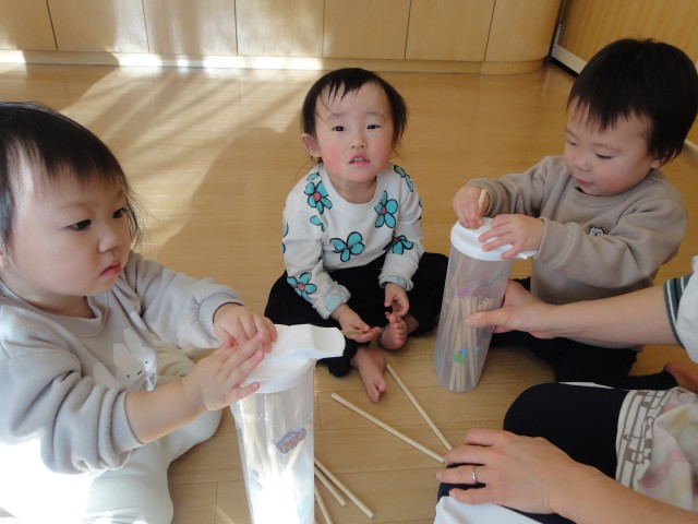 つぼみさんとつくしさんは、それぞれお部屋でおもちゃで遊んでいました。つくしさんのおもちゃはパスタのような細い棒をパスタケースのような細長い筒に入れていくというおもちゃです。真剣に一本ずつ取って入れていましたよ。細いものをつかむ力、小さな穴に入れるという器用さなど、色々な力が付いてきますね。