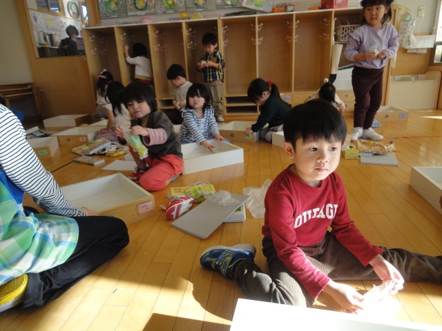さくらさんは、この間サンタさんがしていたゲーム『箱の中身は何ですか?』をやっていました。箱に手を入れるお友だち以外は、何が入っているか知っています。なので、「手袋!」とか「リモコン!」などと答えを言ってしまうこともあり、ゲームにならない場面もありました。それでも、みんな触っただけで正解を導き出していましたよ。