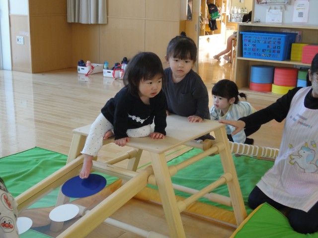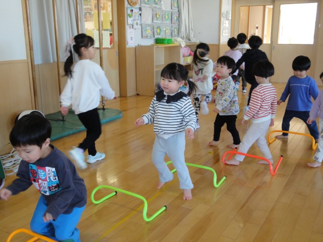 たんぽぽさんはホールでサーキットをしていました。子どもたちは跳ぶ遊具に夢中でした。台の上から跳ぶ、跳び箱の上から跳ぶ、そして、両足でハードルを跳ぶ!両足で跳ぶつもりなのですが、結局片足で跳んでいたりして、見ていておもしろかったです。