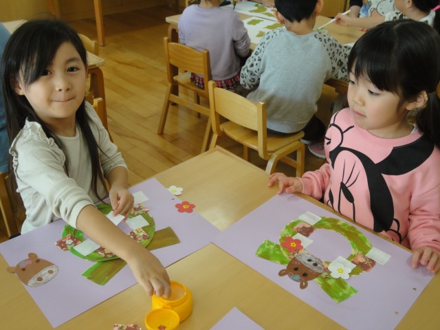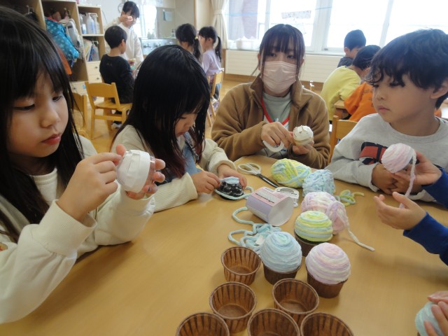 さくらさんのお買い物ごっこの商品は『手鏡』です。先生がカットしてきた台にボンドを塗って、カットした折紙を貼ってかわいい手鏡を作っていました。「私、これ、買うんだ!」と嬉しそうでしたよ。ちゅうりっぷさんでは、カップケーキや小物入れなどを制作していました。毛糸をくっつけていくところは難しそうでしたが、できあがってみるとおいしそうなケーキに見えました。