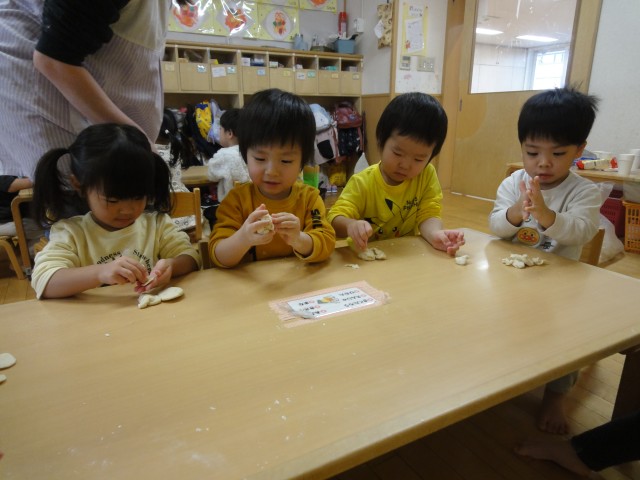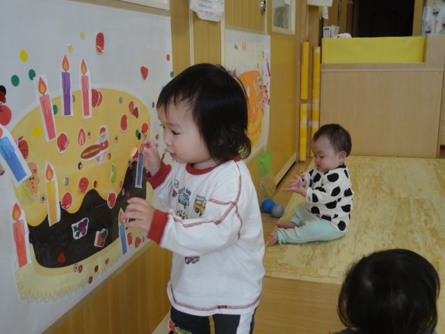 さて、つぼみさんでは、ケーキの絵を壁に貼って、その上にろうそくやイチゴのシールを貼って、おいしそうなケーキを完成させていましたよ。子どもたちが好きなシール貼りの遊びで楽しんでいました。たんぽぽさんでは、小麦粉粘土で遊んでいました。小麦粉粘土は柔らかくて扱いやすいのですが、中にはお洋服を真っ白にしているお友だちもいました。汚してしまいごめんなさい。小麦粉のおいしそうな匂いがするので、「このまま給食室に持っていったらパンになるかもね」とお話をしていました。