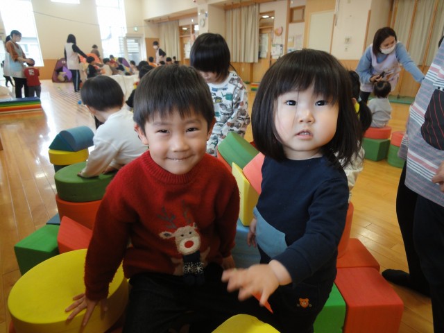 すみれさんとつくしさんは一緒にホールで遊びました。見ていると小さなつくしさんに対して自分も身をかがめてお話をしたり面倒をみたりしているすみれさんがいました。つくしさんも甘え上手で、とっても楽しんでいました。小さな段ボールの箱を車にして、お友だちを乗せて引っ張って遊んでいました。乗っているお友だちにプレゼントを持たせてサンタさんになったつもりで、引っ張るのはトナカイさんのお仕事みたいなストーリーがあるようでしたよ。