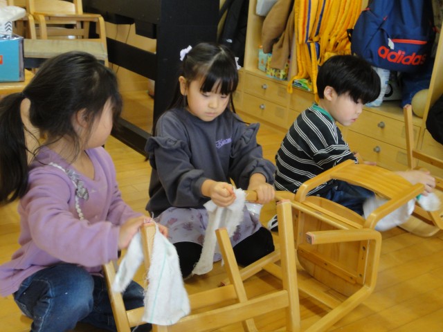 今日は、すみれさんとさくらさんのお部屋では大掃除をしていました。自分の使っている引き出しやロッカーをきれいに拭いて、イスの脚も丁寧に拭いて汚れを取っていましたよ。おうちでも大掃除をしているでしょうか。きれいなお部屋で、気持ち良く新しい年を迎えたいものですね。