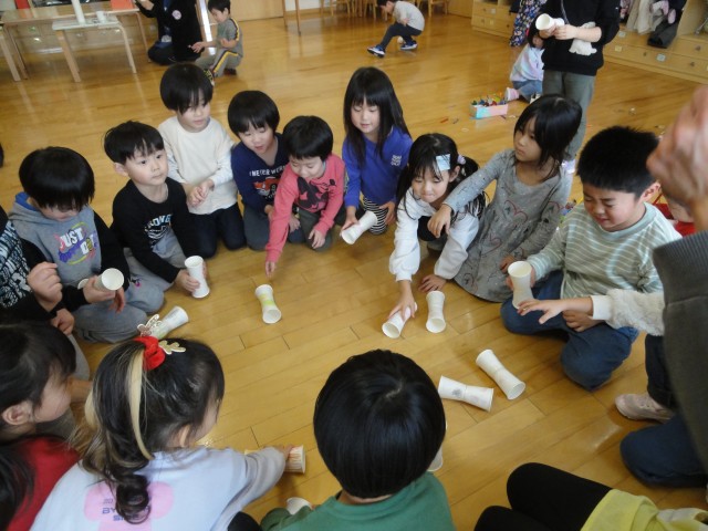 さくらさんは紙コップを二つ、底をくっつけるようにテープで止めたおもちゃを作って遊びました。先生は、輪ゴムを繋げて作ったゴムを使って、遠くに飛ばすおもちゃだと思って作ったのですが、子どもたちは飛ばそうとしてもうまく飛ばせませんでした。すると、紙コップを床に置いて息を吹きかけ転がすという遊びを始めました。そして、しばらくすると上から落として『偶然に立つ!』ことがあると気づき、みんなで誰のが立つかをゲームのように行って遊びました。一つのおもちゃが、子どもたちの独創的なアイデアで、次々に遊び方を変えていくのを見て、子どもたちの柔軟な考え方に感心しました。