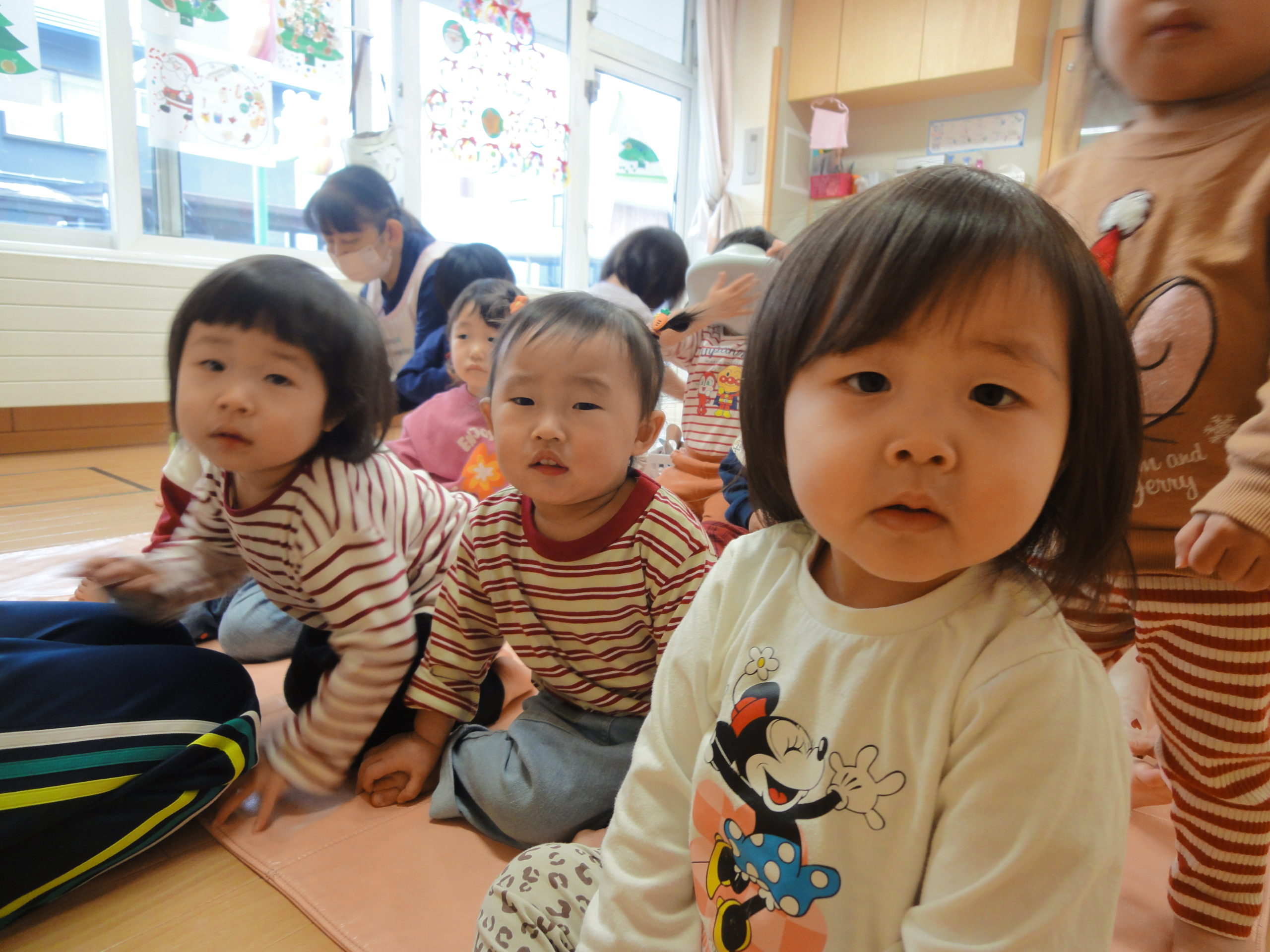 朝起きると、枕元にサンタさんからのプレゼントが届いていた子たちがたくさんいました。中には「サンタさんにと置いておいたハイチューがなくなっていたんだよ」と目を丸くしてお話してくれるお友だちもいました。「あのね、今日は雨だから行けないから、晴れたら行くね」とお手紙があったというお友だちもいましたよ。サンタさんも忙しかったようですね。