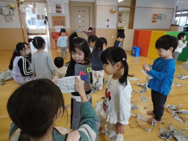 事務室の前の一時保育室から楽しそうな声が聞こえてきました。たんぽぽさんが新聞紙をちぎって的にぶつけたり、小さな紙きれを集めて上に投げたりして遊んでいました。先生に紙を持ってもらい、グーパンチで空手の板割りのように破いて遊んでいるお友だちもいました。みんなとっても楽しそうでした。