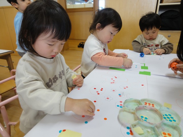 つぼみさんはシール貼り、つくしさんは粘土で遊んでいました。シールは少し手伝うと、自分で剥がすこともできるんですよ。粘土は、型に詰めて棒を刺して、ぺろぺろキャンディのようにしているお友だちもいました。いろんな形になるのがおもしろくて、真剣に取り組んでいる様子でしたよ。