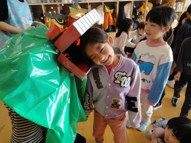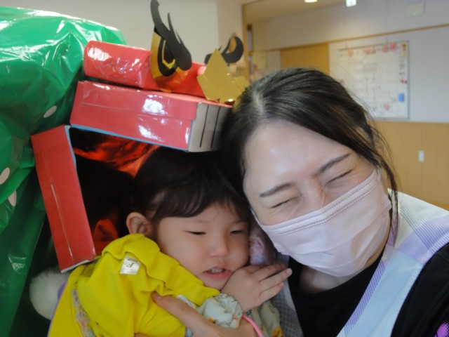 今日は保育園に獅子舞が来てくれました。ピーヒャララ~♪という笛の音と共に獅子が子どもたちのお部屋にやってきてくれました。獅子を見た瞬間、『えっ?』という感じで固まっていましたが、先生が「こうやって頭を噛んでもらうと、一年間元気に過ごせるんだよ」と教えてもらうと、自分から噛んでもらいに来るお友だちもいました。