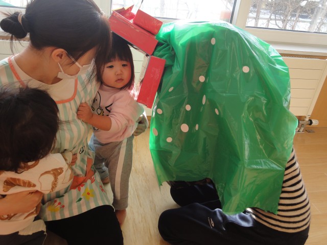 ブラックサンタが来るのでは?とドキドキしていたお友だちも希望していたアンパンマンのおもちゃをもらえたらしくて、一生懸命教えてくれていましたよ。良かったですね。今日はサンタさんのお話でテンションが上がり、みんな幸せな気持ちで過ごしていました。