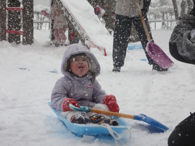 つくしさんは、園庭で遊んでいました。今日は日差しがあって、ちょっと暖かかったです。子どもたちも機嫌よくソリに揺られたり、雪でごちそうを作っておままごとをしたりしていました。さくらさんとすみれさんはことぶき公園で遊びました。昨日からの新雪が子どもたちの膝くらいまで積もっていて、とても歩きにくそうでしたが、少ししたら踏み固められてソリや雪玉作りなど、楽しそうに遊んでいましたよ。ひたすら新雪を歩き進んで、開拓しているような遊びをしているお友だちもいました。先生を雪の中に埋めるべく、座っている先生の足に雪をかけているお友だちもいました。フワフワで真っ白で、とっても気持ちの良い雪でした。